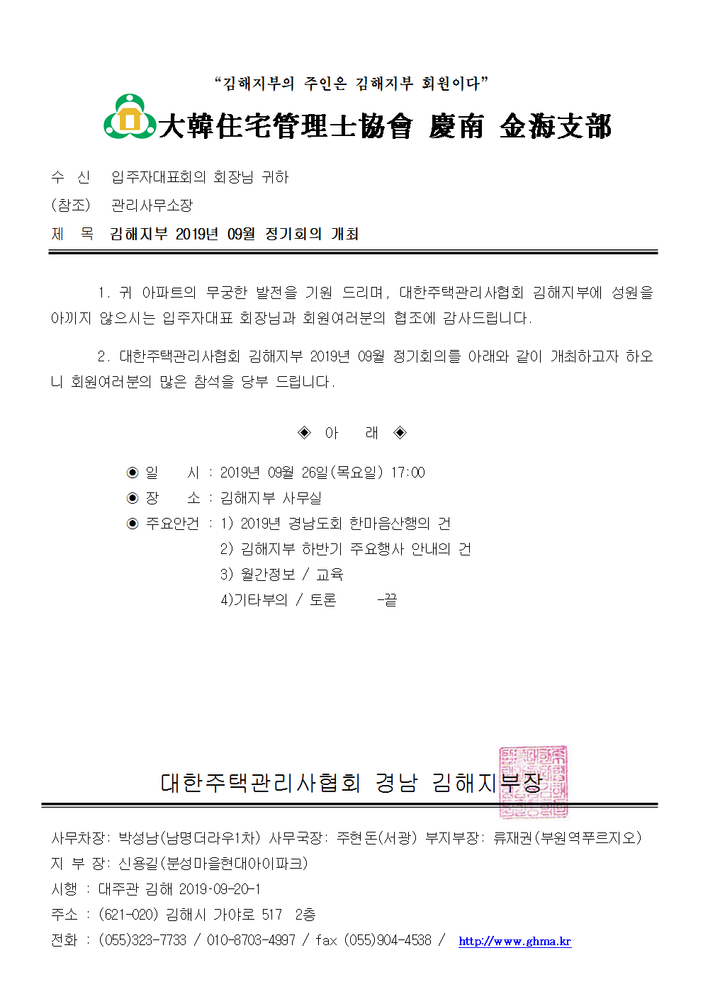 2019³â09¿ù ±èÇØÁöºÎ Á¤±âȸÀÇ °³ÃÖ °ø¹®.hwp (68.5K) [13] DATE : 2019-09-20 14:34:32