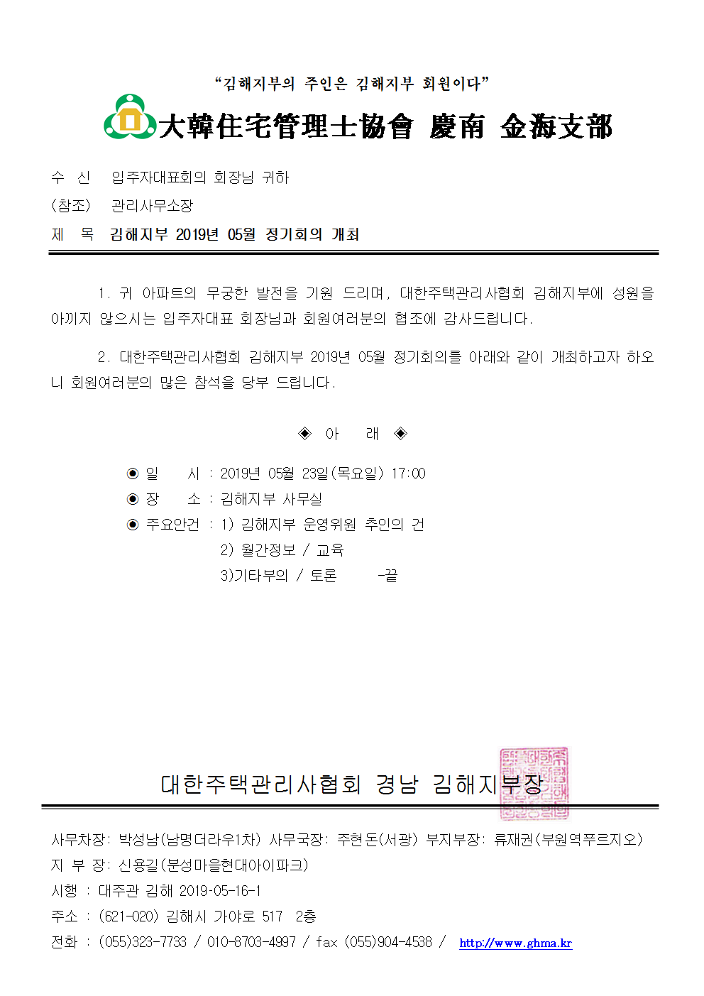 2019³â05¿ù ±èÇØÁöºÎ Á¤±âȸÀÇ °³ÃÖ °ø¹®.hwp (55.5K) [22] DATE : 2019-05-16 14:00:14