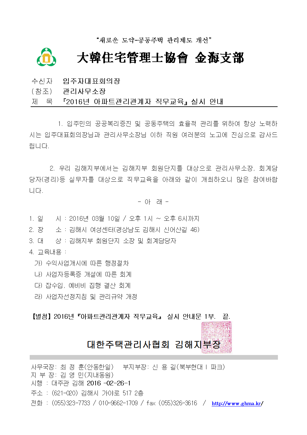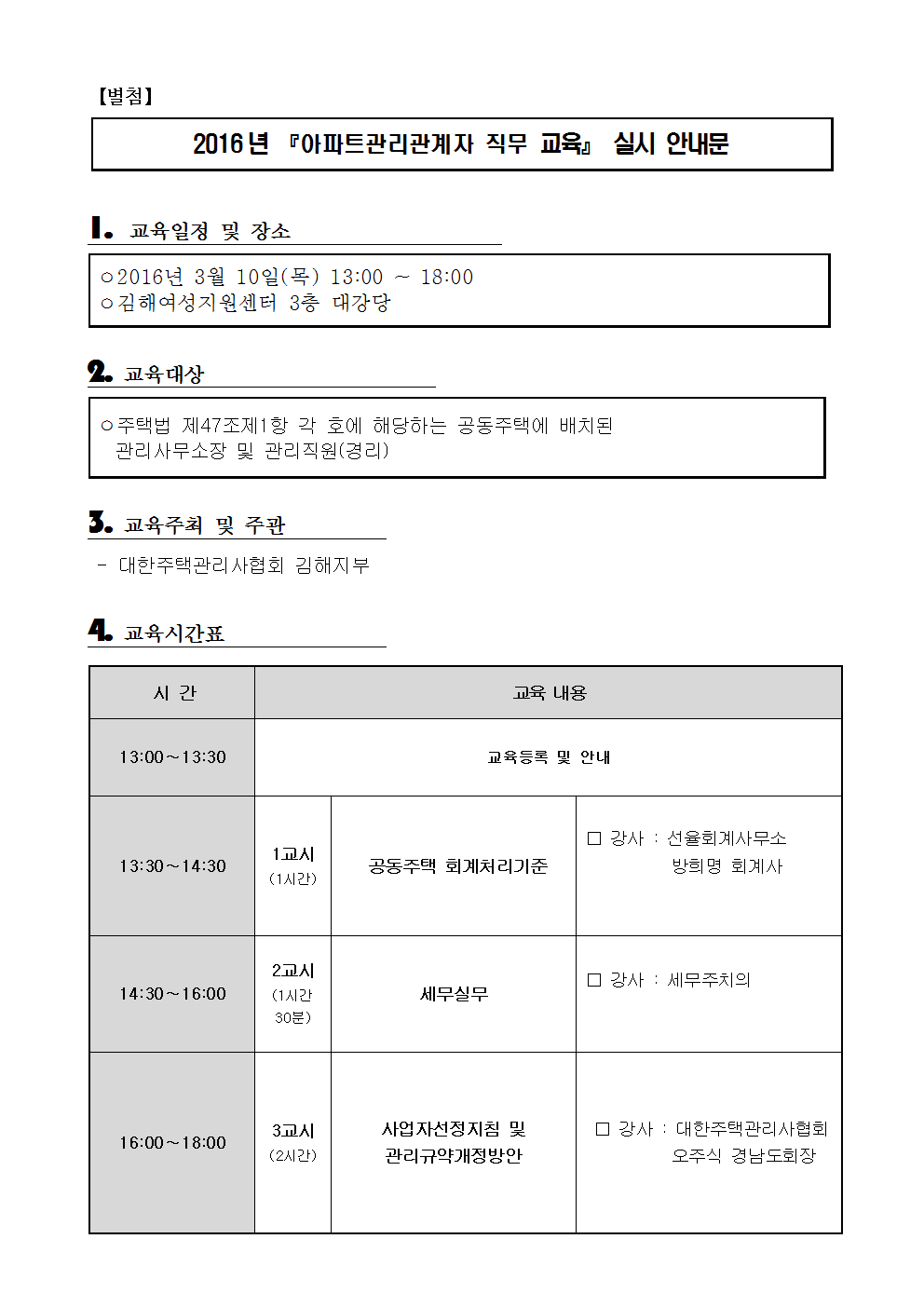2016³â 03¿ù 10ÀÏ ¾ÆÆÄÆ®°ü¸®°ü°èÀÚÁ÷¹«±³À° Âü¿©°ø¹®.hwp (264.0K) [112] DATE : 2016-02-26 17:17:43