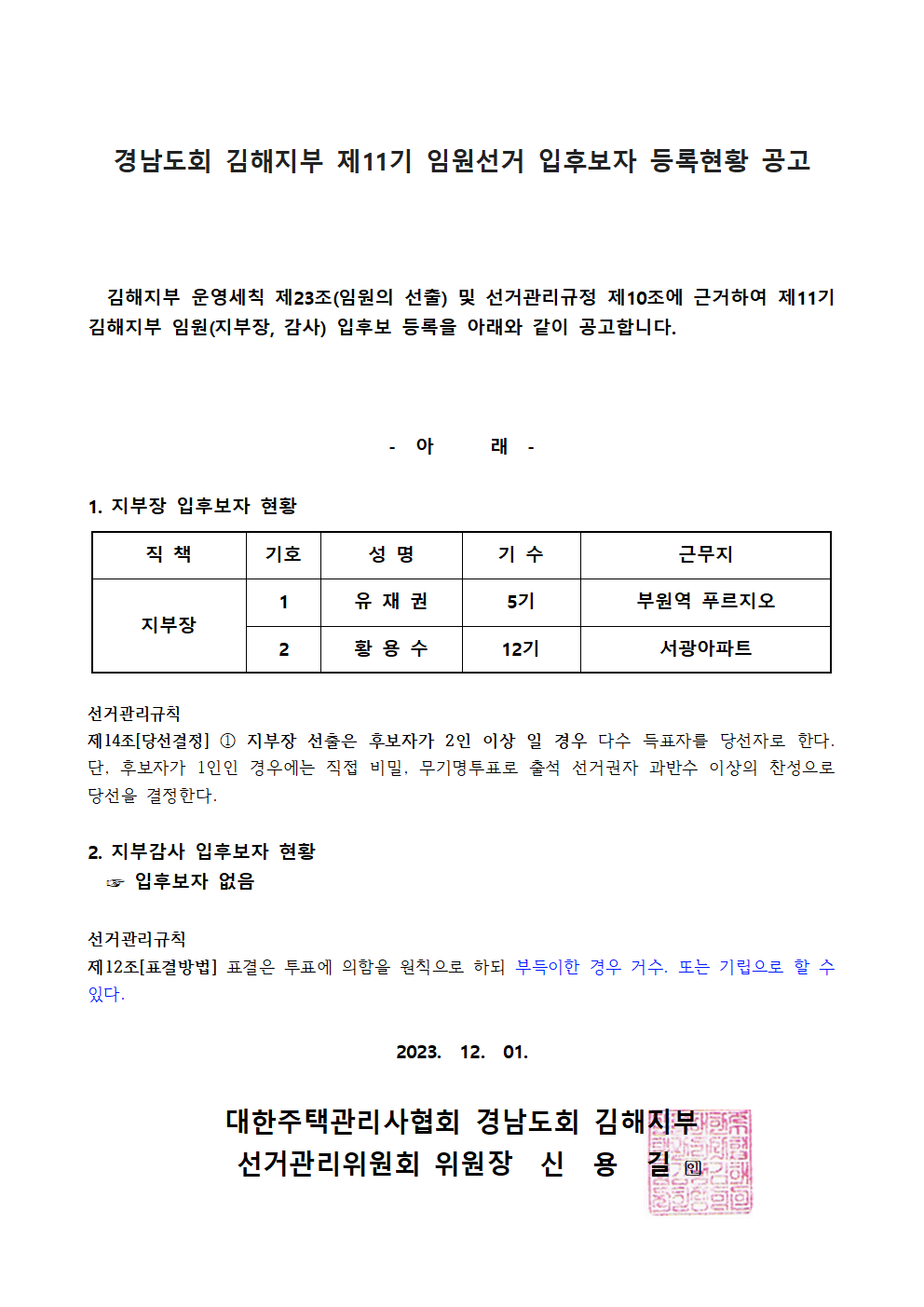 ±èÇØÁöºÎ Á¦11±â ÀÓ¿ø¼±°Å ÀÔÈĺ¸ÀÚ °ø°í