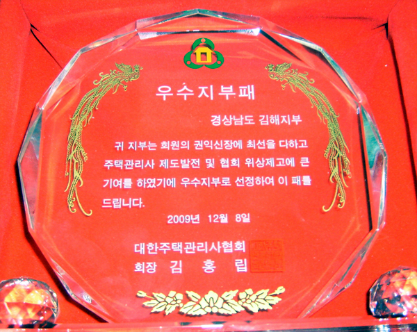 2009³â ÁÖÅðü¸®»çÇùȸ Á¤±âÃÑȸ(2009. 12. 08)¿¡¼ ±èÇØÁöºÎ°¡ ¿ì¼öÁöºÎ»óÀ» ¼ö»óÇÏ¿´À¸¸ç ÃÖÁ¤ÈÆ Ãѹ«°¡ ÇùȸÀå ǥâÀ» ¹Þ¾Ò½À´Ï´Ù.