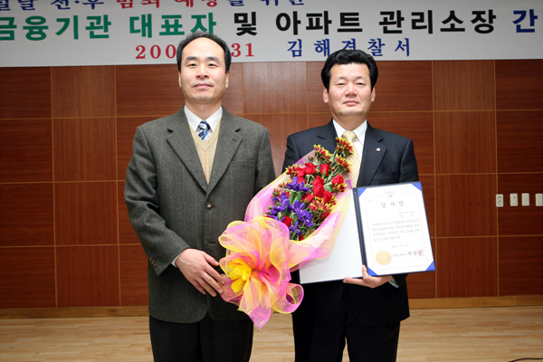 2008³â 1¿ù31ÀÏ ¸ñ¿äÀÏ ±èÇØ°æÂû¼ 4Ãþ ´ëȸÀǽǿ¡¼ »ï¹æµ¿¿ø ¾ÆÆÄÆ® À念¼ÒÀå´ÔÀÌ ±èÇØ°æÂû¼Àå »óÀ» ¼ö»ó ÇÏ¿´½À´Ï´Ù.