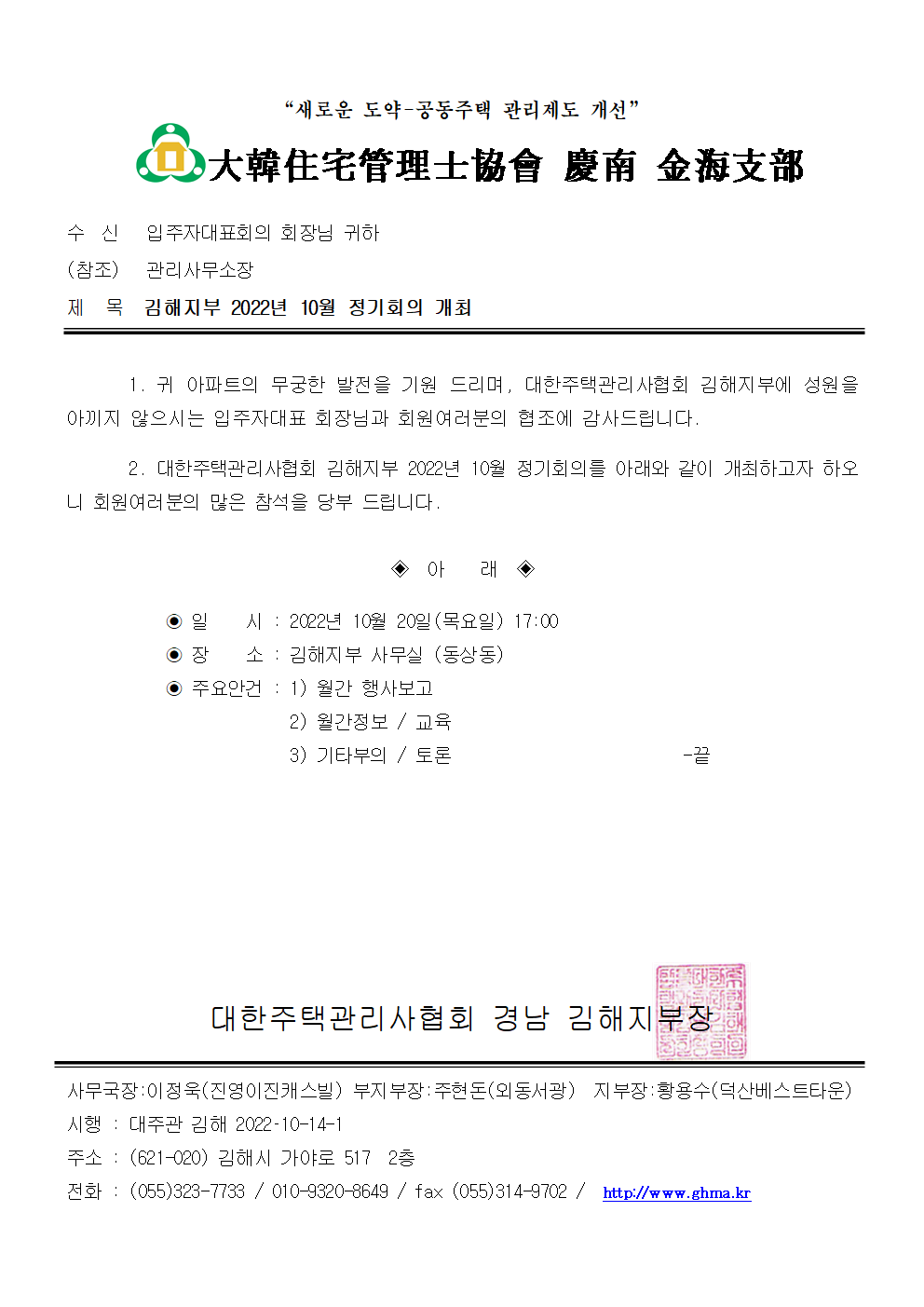 2022³â ±èÇØÁöºÎ 10¿ù Á¤±âȸÀÇ ¾È³»
