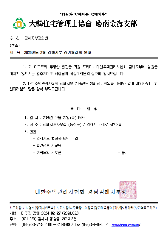 2025³â 2¿ù ±èÇØÁöºÎ Á¤±â¿ù·Êȸ °øÁö