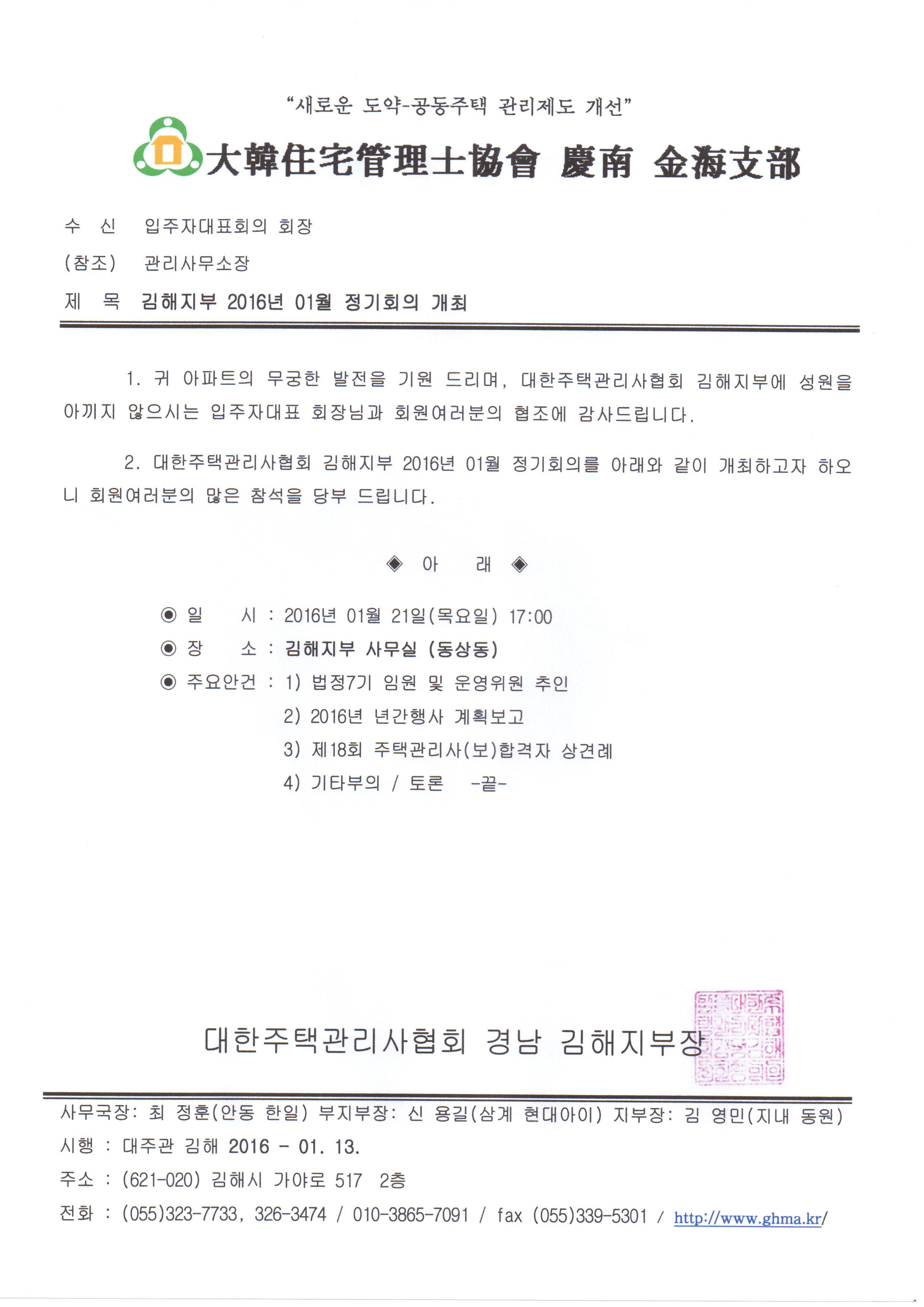 2016³â 01¿ù ±èÇØÁöºÎ Á¤±âȸÀÇ ¾È³»