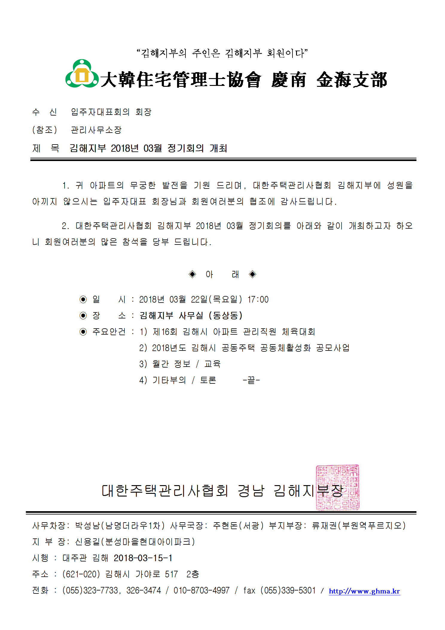 2018³â03¿ù22ÀÏ ±èÇØÁöºÎ Á¤±âȸÀÇ °ø¹®.hwp (75.0K) [20] DATE : 2018-03-15 14:30:03