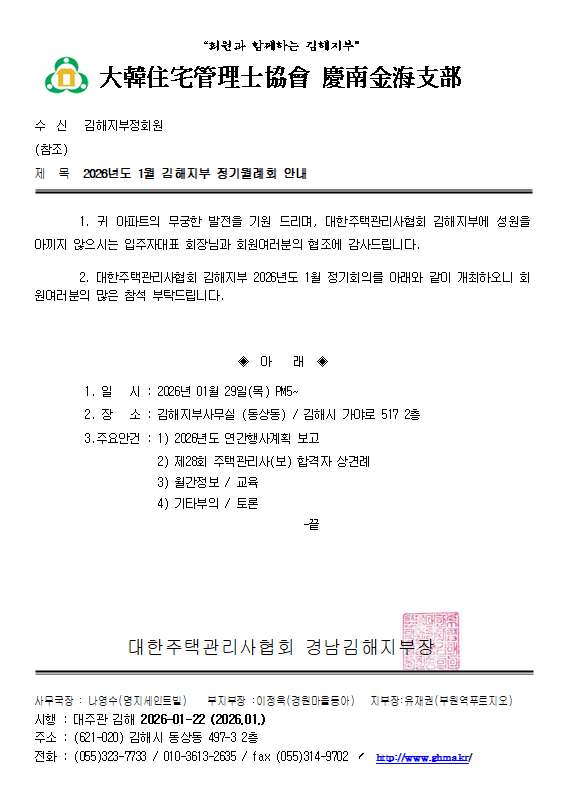 2026³â 1¿ù ±èÇØÁöºÎ Á¤±â¿ù·Êȸ °øÁö